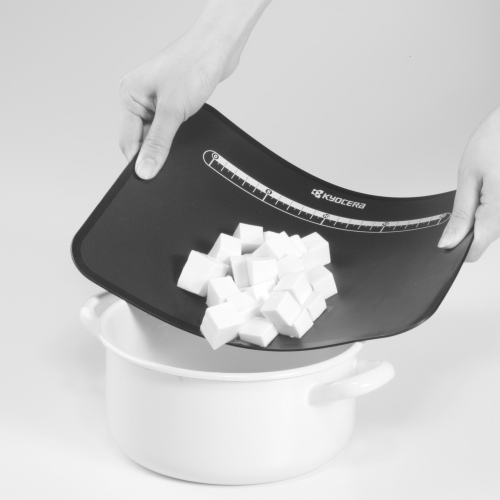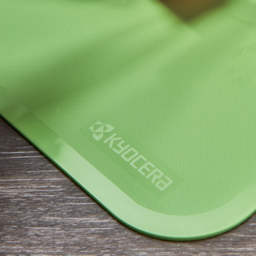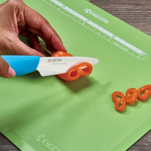 Slip-resistant surface holds food in place while chopping.